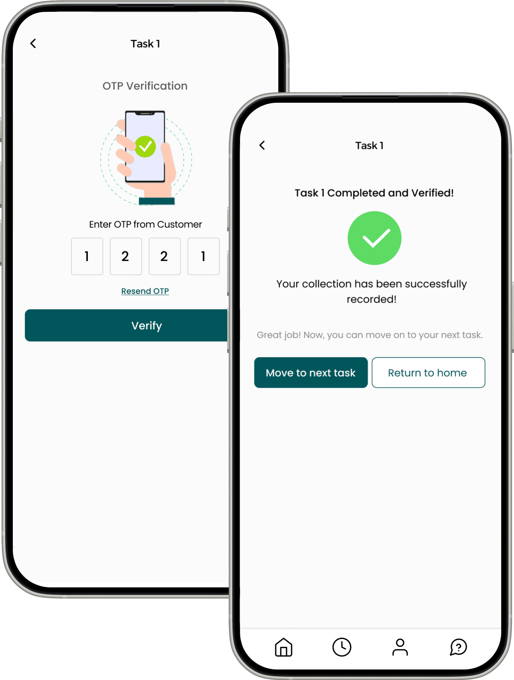Task Screen: One clear CTA (“Start Task”), progress bar, and real-time confirmation feedback.
