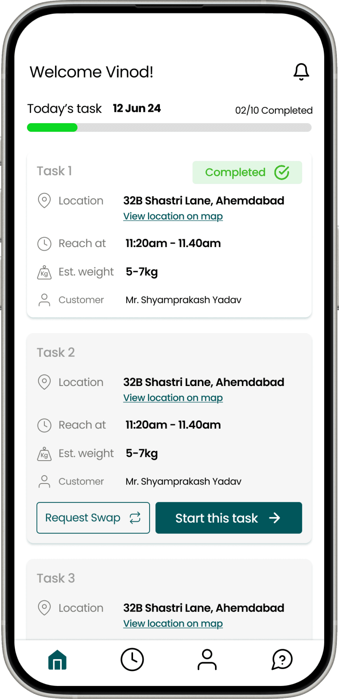 Divided task information into three clear sections: task details (where/when), scrap quantity & materials, and task completion verification. Providing a clarity. Also an option to contact the customer in case of any query.
