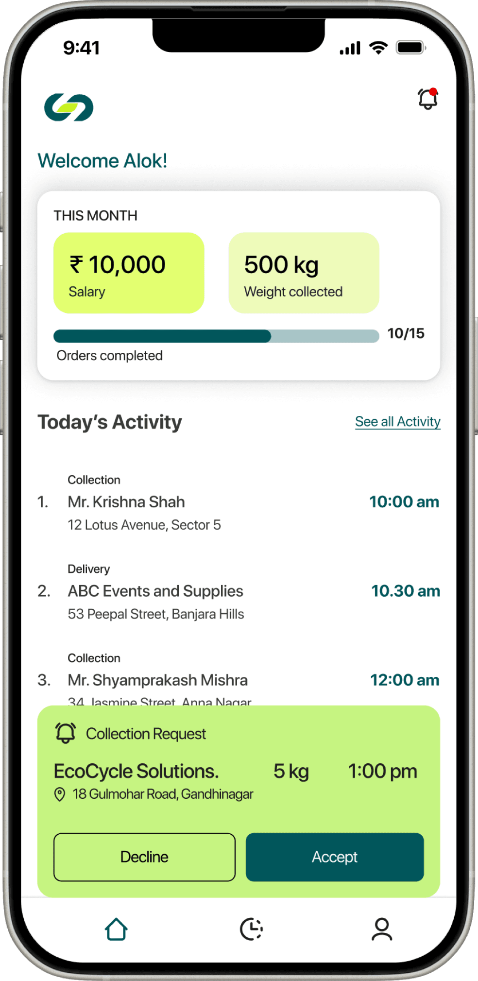 Dashboard: Focused on “Today’s Pickups,” customer details, and simple task progress.